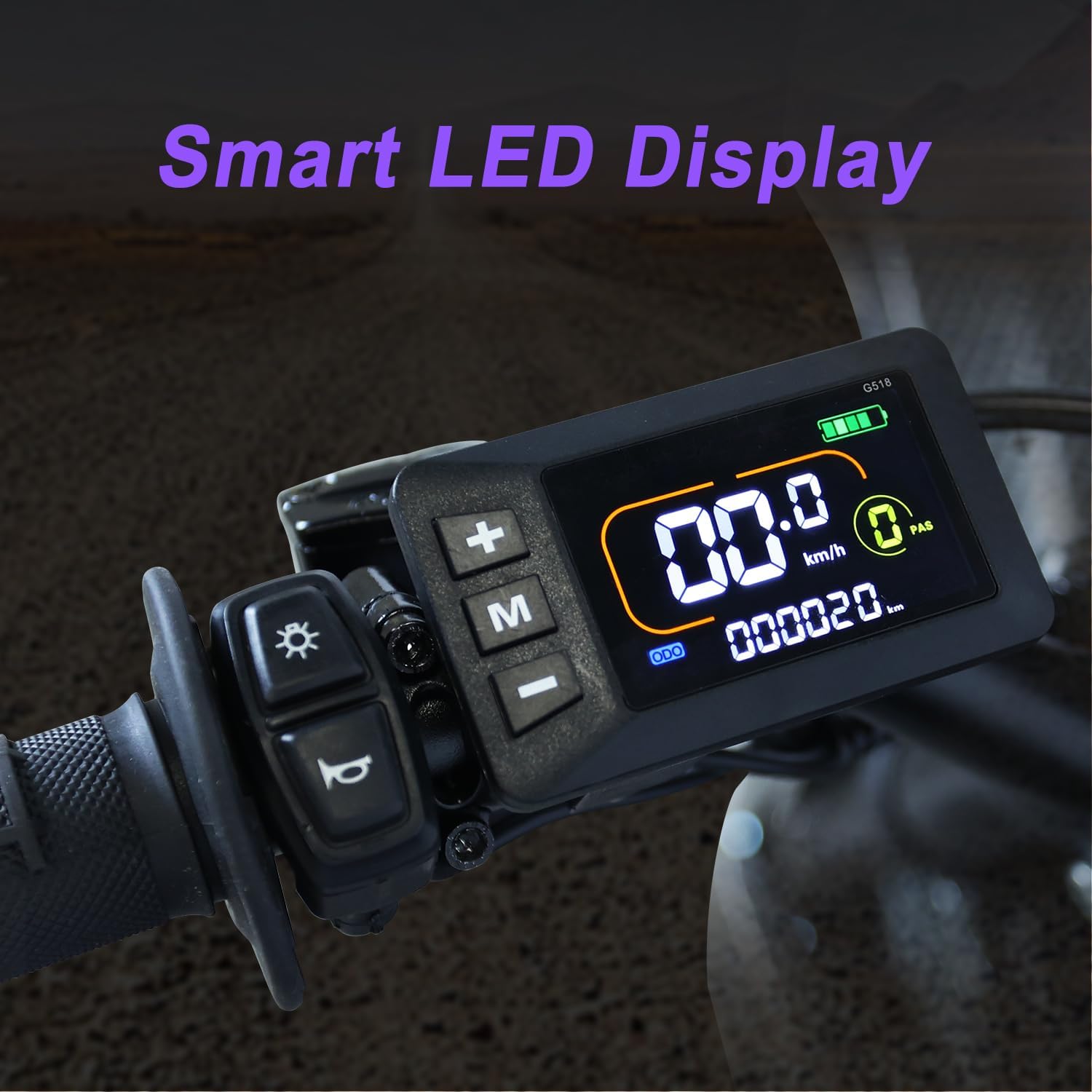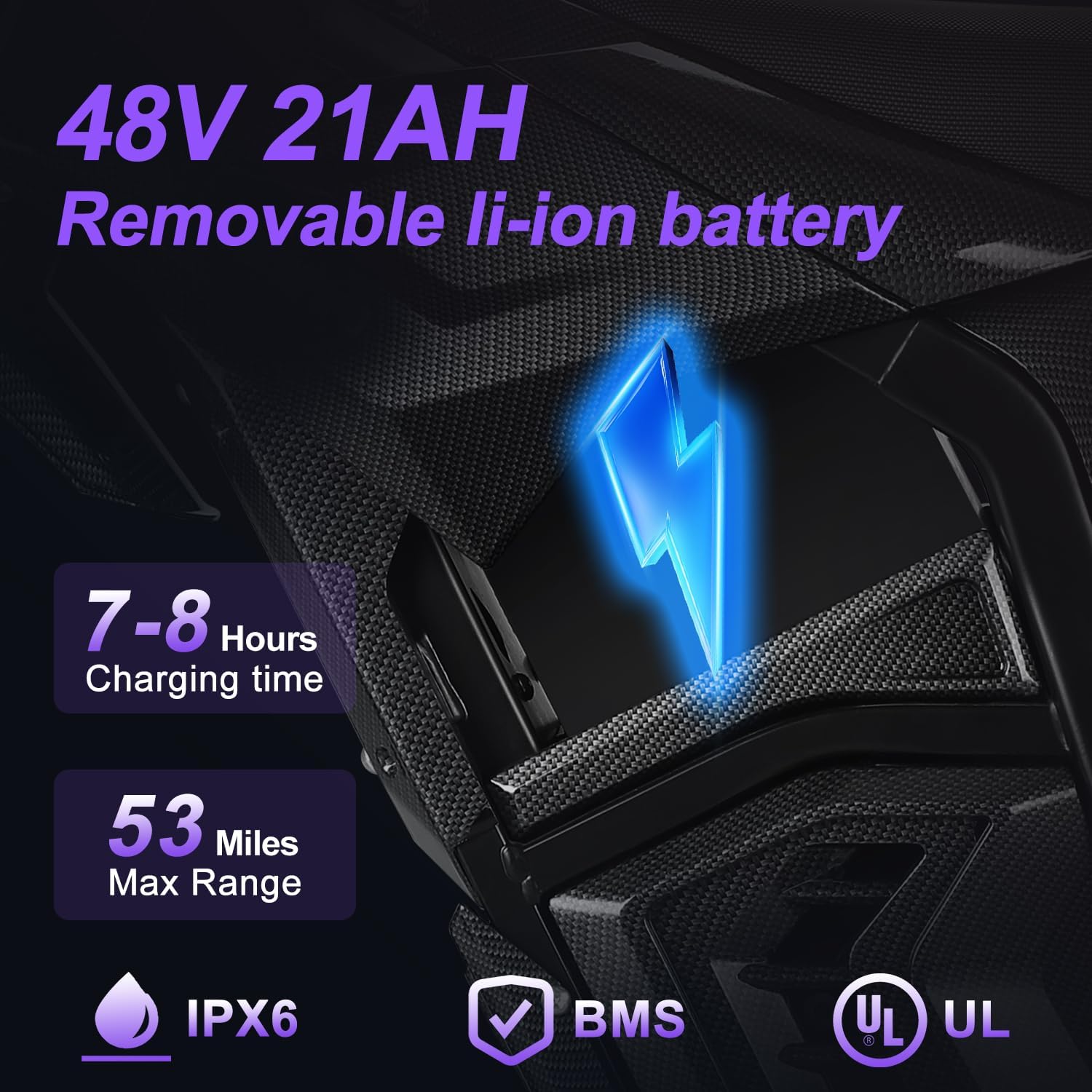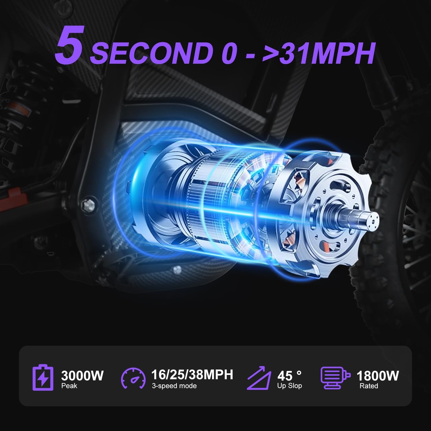Part 1: Powerful Performance This electric dirt bike has a strong 2600W silent motor for smooth rides. It reaches maximum speeds of 40 MPH with three adjustable speed modes. You can choose between 16 MPH, 25 MPH, or 38 MPH based on riding skill. The 48V 21Ah battery gives up to 53 miles of range on one charge. It takes 7-8 hours to fully charge and be ready for your next adventure.