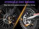 Part 2: Built Tough and Safe The steel frame and rims support riders up to 286 lbs securely. This off-road motorcycle fits riders aged 13 and above perfectly. Advanced hydraulic disc brakes on both wheels stop quickly at any speed. The 14-inch front and 12-inch rear tires handle dirt trails, mud, and grass easily. The carbon fiber style design looks modern and sporty for young riders.