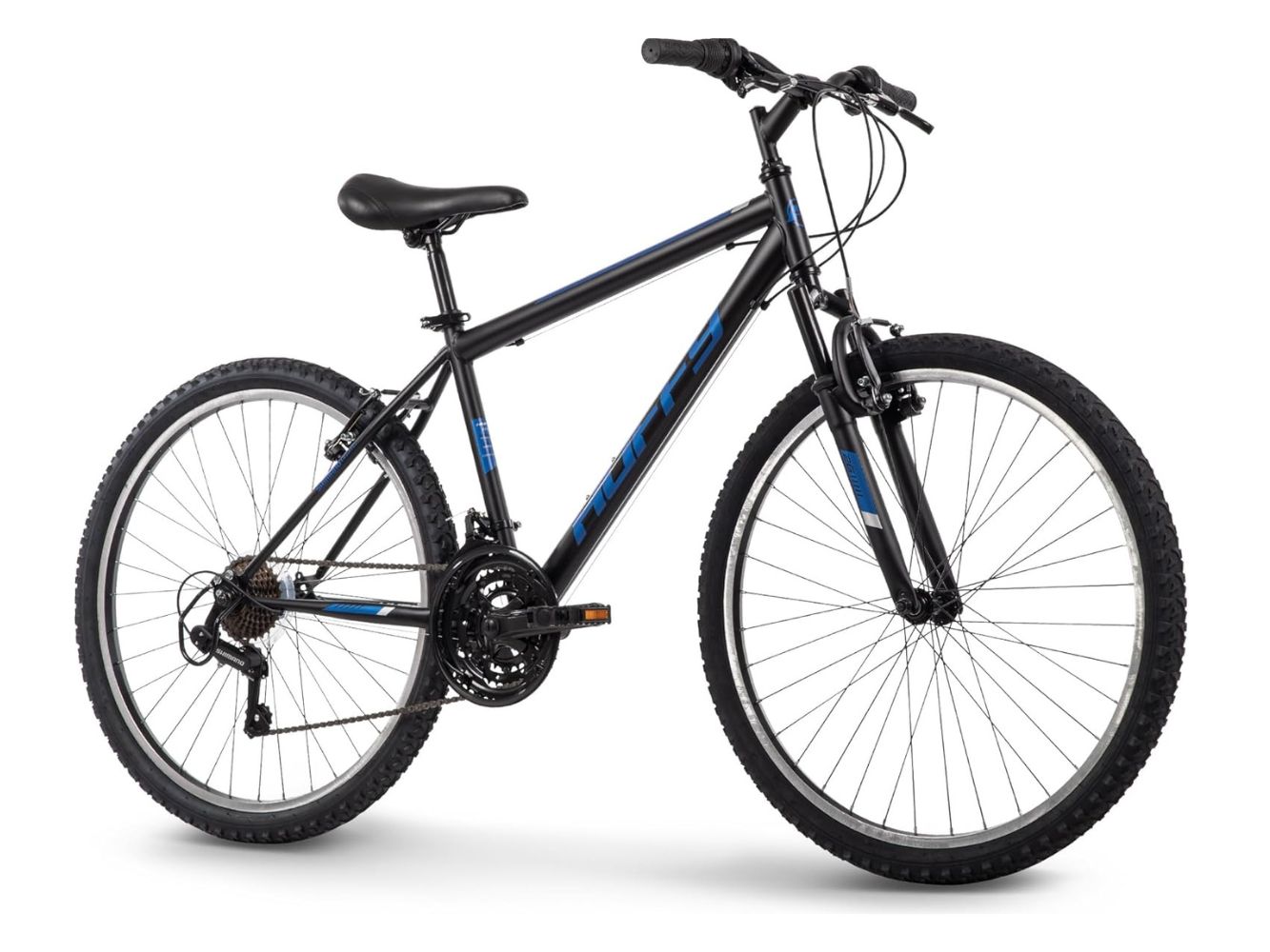 Part 1: Gear System and Design This hardtail mountain bike features 21-speed Shimano twist shifting for smooth gear changes. You can easily switch gears to handle flat roads, steep hills, and rough trails. The sleek matte black frame looks modern and stylish for daily rides. It comes in three sizes – 20“, 24“, and 26” wheels to fit boys, girls, men, and women. The rugged frame construction withstands outdoor adventures and regular commuting.