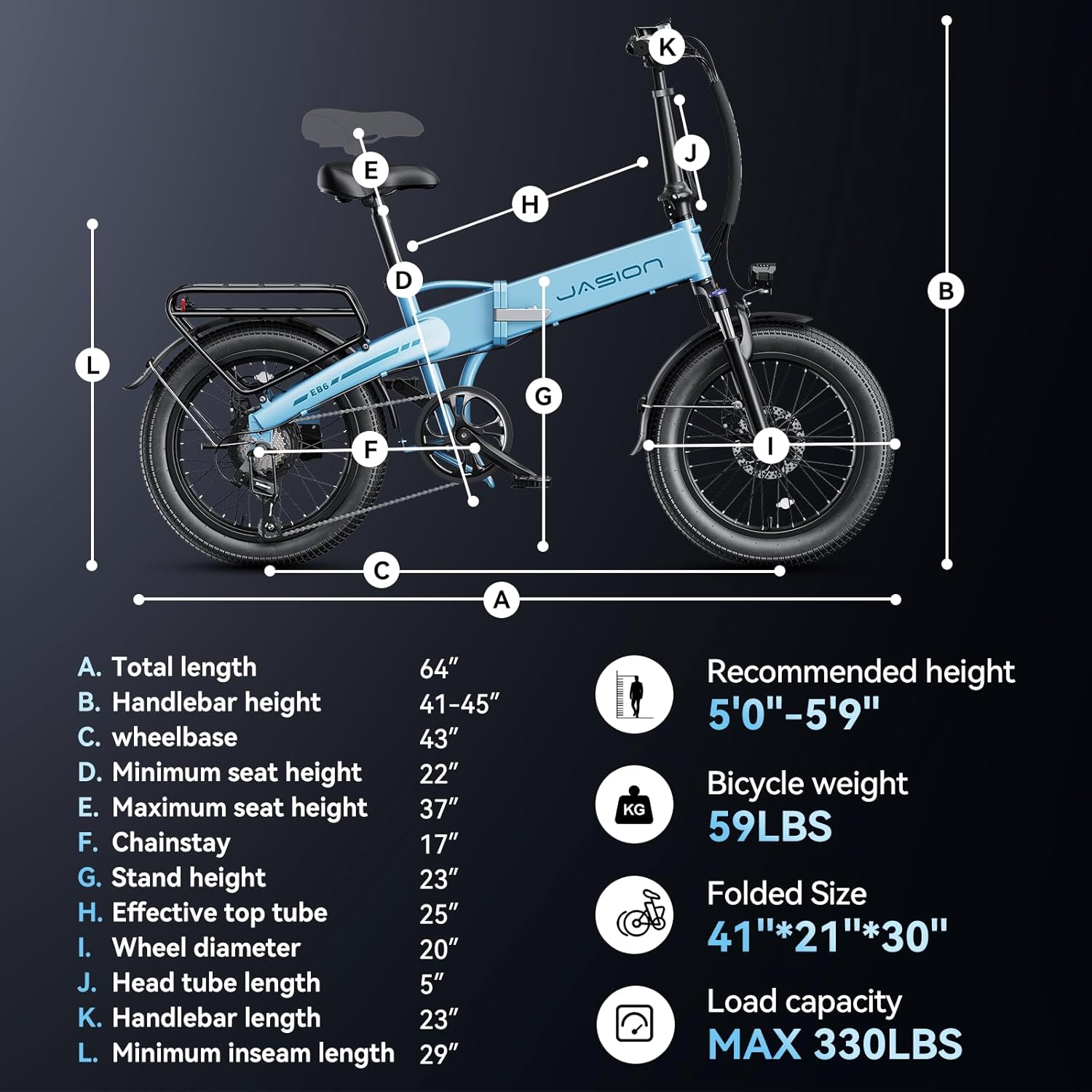 The Jasion Electric Bike for Adults features a powerful 1000W peak motor delivering up to 25MPH top speed, making it perfect for city commuting and hill climbs. Equipped with a 504WH removable battery, it offers a long-range ride up to 45 miles per charge. Its 20″ fat tires provide excellent grip and stability on all road surfaces, while the front suspension ensures a smooth and comfortable ride. The folding design allows for easy storage and portability, weighing only 59LBS. With a strong weight capacity of 330LBS, it accommodates riders of various sizes safely.